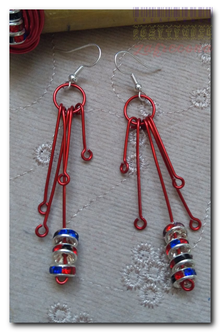 Czerwone sople - kolczyki wersja 2 w kategorii: Biżuteria z drutu aluminiowego Materiały: Drut aluminiowy biżuteryjny 1 mm Koraliki z cyrkoniami Cały komplet zobaczysz TUTAJ. MOJE INNE, FAJNE, RĘKODZIELNICZE ARCYDZIEŁA- UUU, OOO ... Błękitno-wrzosowe kryształki Kryształowe sopelki wersja 2