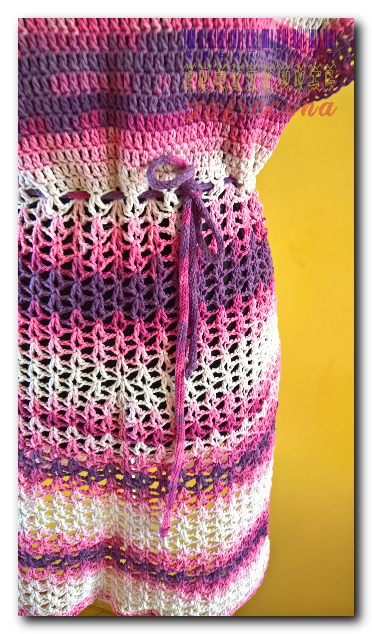 Sukienka wykonana jest słupkami i ściegiem V stitch, w całości metodą "top down". Dodatkiem jest paseczek zrobiony na młynku dziewiarskim.