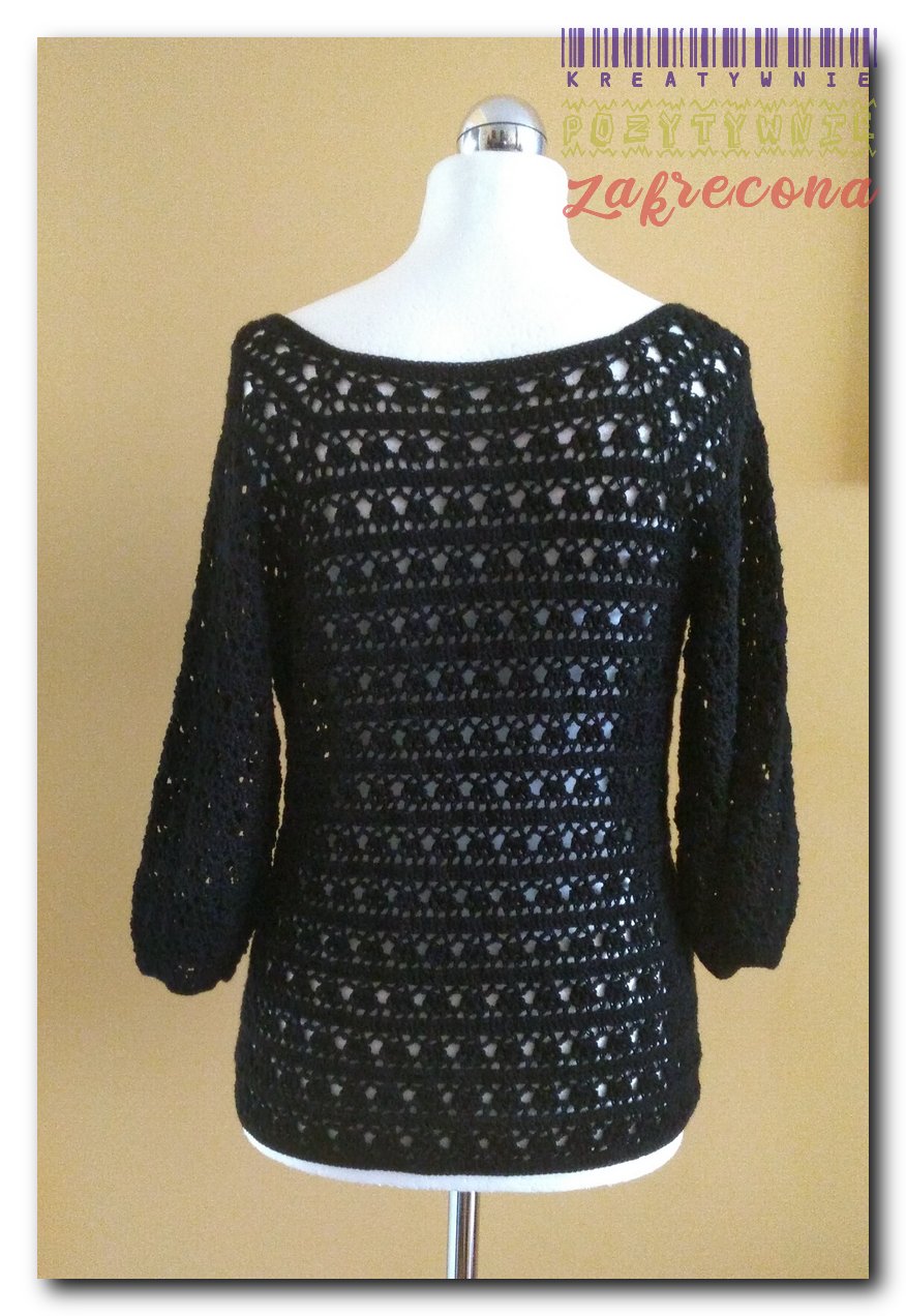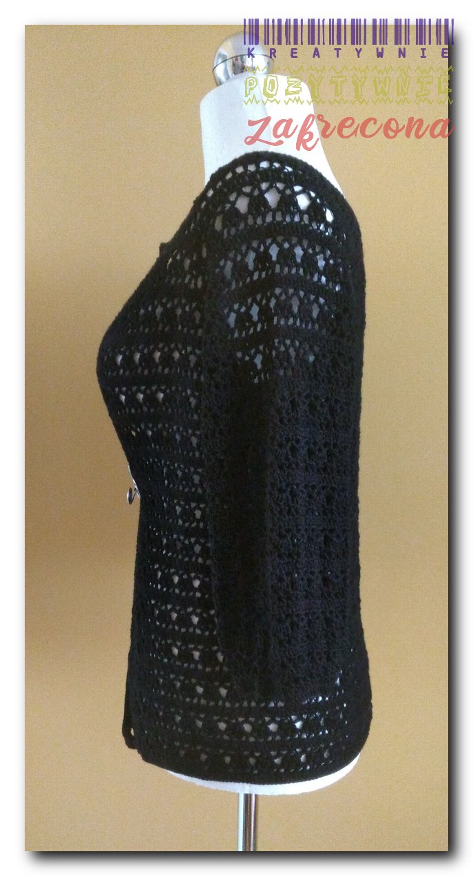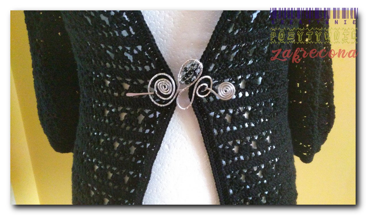 Sweterek czarny, ażurowy w kategorii: Na szydełku - ubrania wiosenne i letnie Szydełko: 2,75 mm Włóczka: Alize Diva Sweterek jest zapięty Spinką z koralikami szklanymi. MOJE INNE, FAJNE, RĘKODZIELNICZE ARCYDZIEŁA- UUU, OOO ... Broszka czerwono-czarna Letni top "Ważki"
