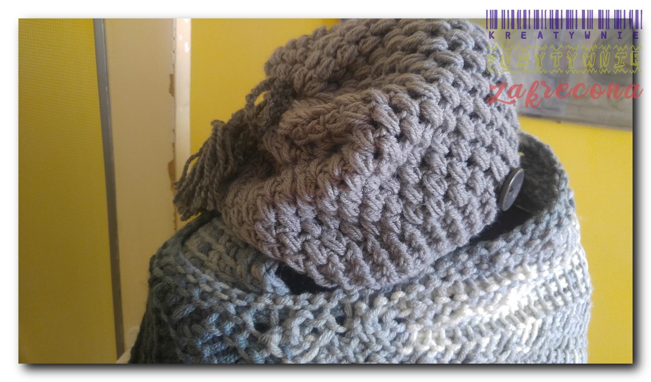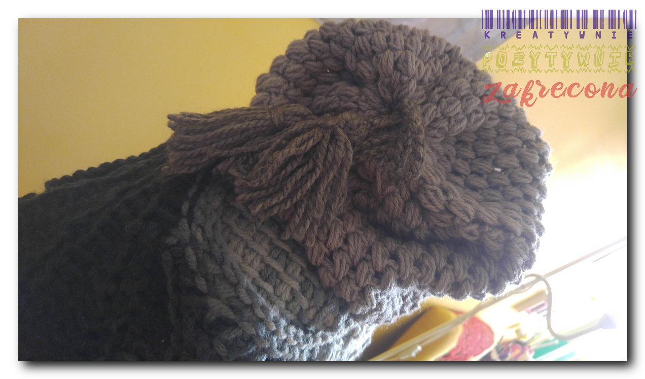 Szal wykonany jest w całości ściegiem tunezyjskim. Czapka widoczna na zdjęciu nie należy do kompletu i jest wykonana jest ściegiem "puff stitch" z włóczki Arelan Puchata Kotka.