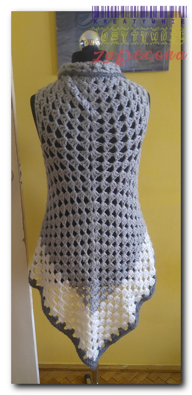 Szaro-biała kamizelka w trójkąt w kategorii: Na szydełku - ubrania jesienne i zimowe Włóczka: Arelan Puchata Kotka Szydełko: 6mm MOJE INNE, FAJNE, RĘKODZIELNICZE ARCYDZIEŁA- UUU, OOO ... Wrzosowa kamizelka Długa, żółta kamizelka